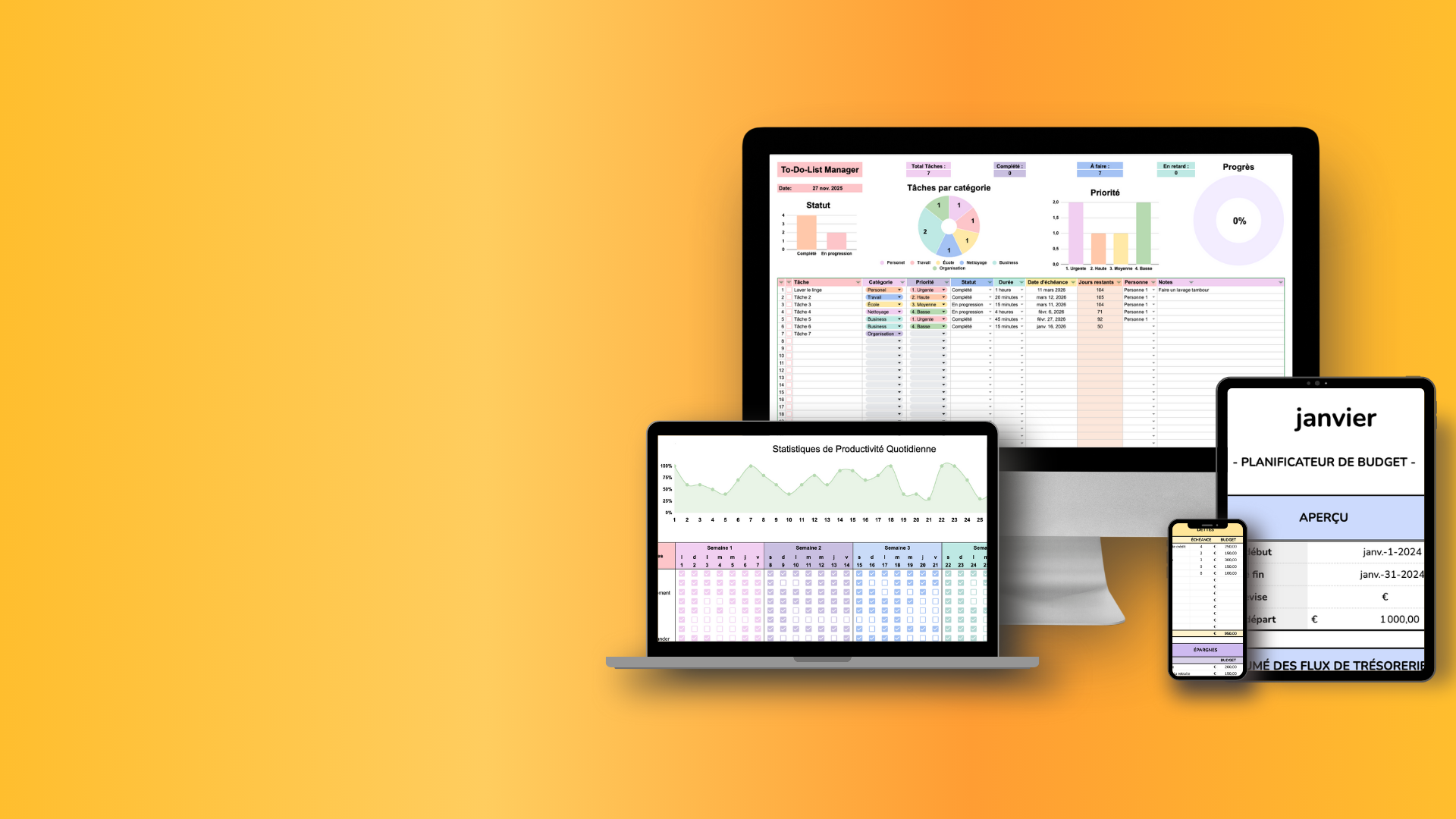 Oubliez les abonnements coûteux et les applications compliquées. Notre Planner fonctionne sur Google Sheets, un outil que vous connaissez déjà, 100% gratuit et accessible sur votre ordinateur, tablette et téléphone.